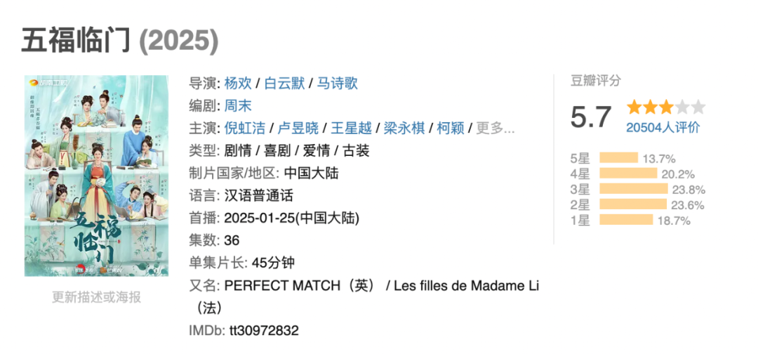 芒果TV雖然上線了為春節檔量身定製的《五福臨門》,但5.7的豆瓣評分註定了它很難實現口碑發酵。在《墨雨雲間》的成功之後,於正試圖通過“短劇化”再下一城,卻證明了自己並沒有駕馭多線羣像劇的能力,交叉呈現的五對CP令劇情散亂、跳躍,讓觀眾很難沉浸帶入。《五福臨門》熱播期雲合集均的落點可能只有2000多萬,也暴露了芒果TV的劇集基本盤並不穩固,仍然處在“劇帶平台”而非“平台帶劇”的階段。
