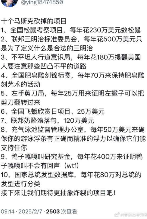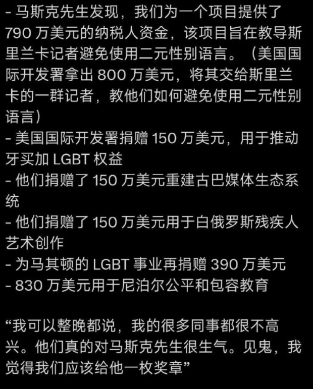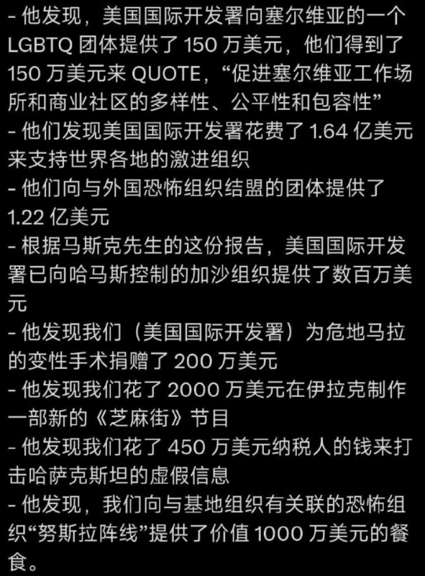 由此可見,馬廠公不只是斷狗糧,而是把狗窩都炸了,這下連犬吠聲都很難聽到了。現在馬斯克的口碑兩極分化,懂王粉絲、紅脖子MAGA稱讚他“公忠體國”、“掃貪除虐”,民主黨、建制派罵他奸臣誤國、“妖僧禍亂朝綱”、“敗壞美國根基”……美國很多人震驚於“國際開發署”的項目之離譜,他們甚至還發現,美國的錢不只是流向烏克蘭、以色列這些美國的“盟友”,甚至有大量的資金流向阿富汗、敍利亞、也門這些美國的“敵人”……合着美國“國際開發署”的遠程養殖,還是兩頭養?