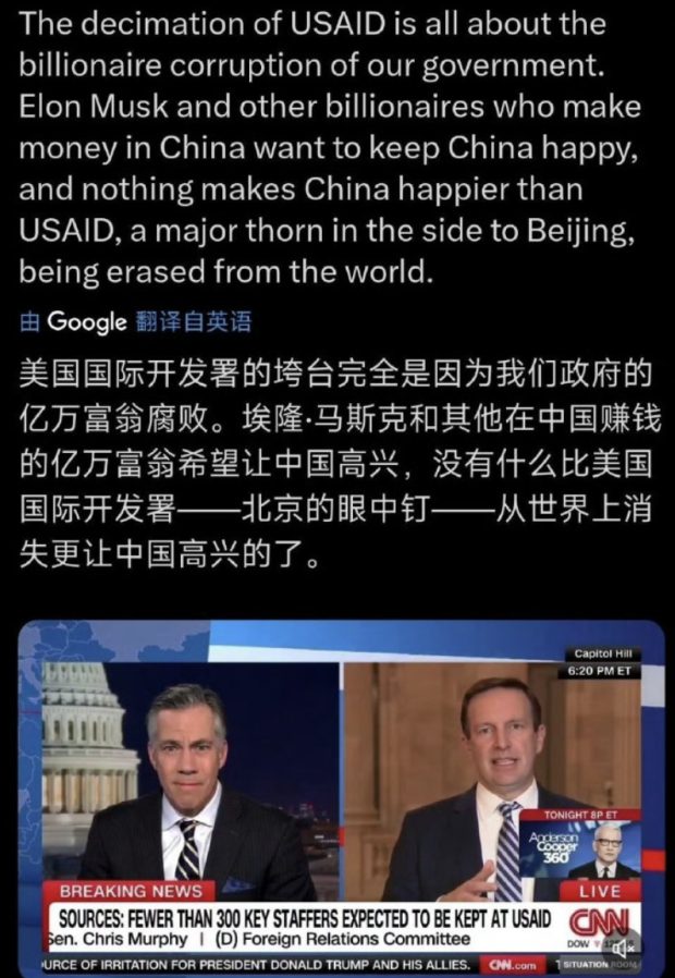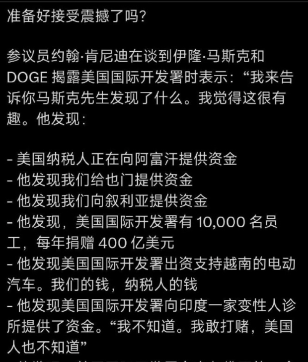 實際上,就算美國有資金被用於“反美國”,也一點都不稀奇,幾十年前就有智者寫過一本書,叫做《美國反對美國》,把這種“賣絞索絞死自己”的資本主義劣根性講得無比透徹了……美國如今就在踐行這個預言。美國真正的統治階級是那幫“天龍人資本”,他們寄生成性,是沒有祖國的,美國“國際開發署”USAID也出錢支持哈馬斯,敍利亞,胡塞武裝這些反美組織,一點都不奇怪,他們花美國納税人的錢,在全球各地挑起戰爭和衝突,兩頭支持、兩頭下注,搞亂各個國家和地區,逼迫當地資金去美國避險,推高美國資產價格,然後美資下場廉價收割,一邊吸血,一邊徹底掌控這個國家的政治經濟命脈。你信不信,美國可以甚至一邊支援烏克蘭,一邊支持俄羅斯?不要看它説什麼,就看戰爭和衝突發生後,多少熱錢流向美國?多少資源、企業、土地被美國資本收購?很多人其實被這個“賬單”的障眼法搞糊塗了,真以為“國際開發署”、CIA他們就是一幫腐敗、亂花錢的廢物,實際上,它們幾十年來也是為美國吸血全世界立了大功、掙了大錢的……真正懂行的“美國統治階級”已經在痛心疾首,認為馬廠公在毀掉美國霸權的根基。只不過,他們掙的錢,沒有和紅脖子MAGA們分而已,底層美國人窮困、失業、打三份工、賣血、破產、淪為流浪漢、悲慘地死去,而大量的“史密斯專員”暴富,美國的霸權紅利,只被少數人吃到了嘴裏,所以,MAGA們暴怒了。馬斯克和特朗普這麼幹,未必是真的為了美國好,大概率還是利用民眾的怒火,進行“黨爭”、“奪權”、“爭利”、“復仇”。