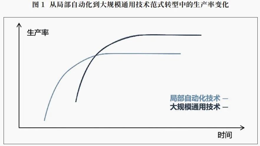 **回顧歷次工業革命可以發現,工業技術發展存在一個基本的三階段規律。**在初始階段,新技術的發展從局部自動化專用技術開始,這往往是由於企業掌握了生產過程中某些步驟的特定規律,便試圖設計新的工具以簡化勞動過程,提高生產率,併產生有效利用工具的新技能。然而,局部自動化有邊際收益遞減的特點,隨着勞動生產率提高帶來的產業規模擴大,企業家、發明家便有動機在更大範圍內引入全面自動化的通用技術。**但是,只有引入的通用技術具有規模收益遞增的特徵,投資過程才能持續,才能在與專用技術的競爭中獲勝,最終完成生產過程的範式轉變。**因此,範式轉變的階段可能持續較長的階段。最終,整個產業又在新的通用技術平台上,面向更大的市場重新分工、重組生產組織,以充分發揮新技術的潛力(圖1)。工業社會經過這三個階段的調整後,不僅勞動生產率會有階梯式的躍進,經濟社會組織方式也往往會發生全面改造。
