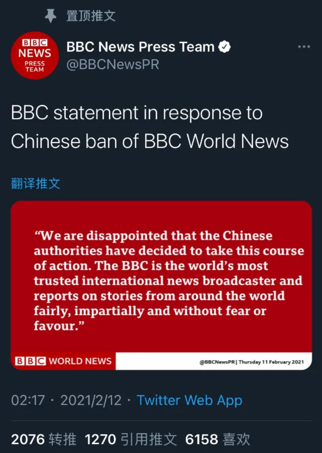 在被中國官方制裁後,BBC當天就發了一份全球聲明,寫的是:“BBC是全球最受信任的新聞機構,我們公正公平地報道全球事件,沒有任何畏懼或討好。”