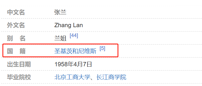 **而張蘭本人,根本就不是中國國籍,而是聖基茨與尼維斯國籍。**這是個啥地方呢?不是沒有中國國籍的假中國人,卻打着“低俗愛國”的旗號,早就該被封殺了。咱們中國人講究的是,“家醜不可外揚”,可張蘭呢?卻反覆藉助“家醜外揚”,來薅流量,賺爛錢。