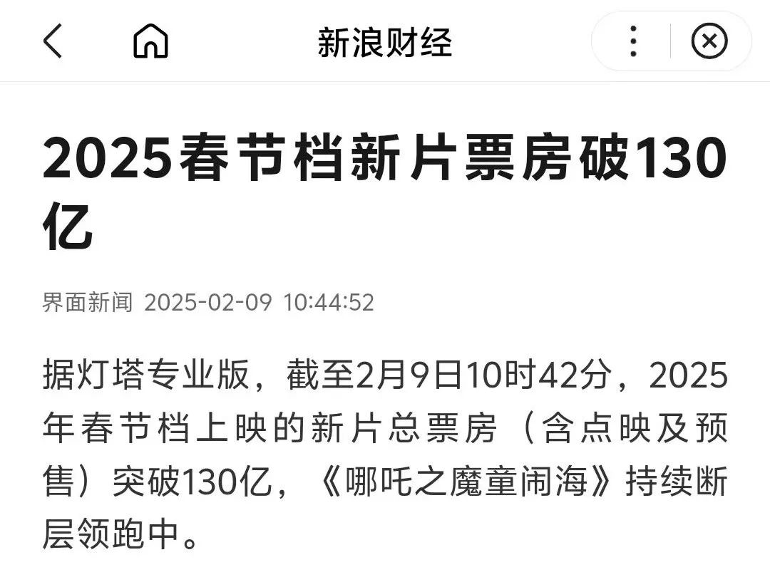 據網絡平台數據,截至2月9日14時許,電影《哪吒之魔童鬧海》(以下簡稱《哪吒2》)上映12天,票房(含預售)突破77.38億,登頂全球影史單一市場票房榜。同時,2025年春節檔新片總票房破130億。
