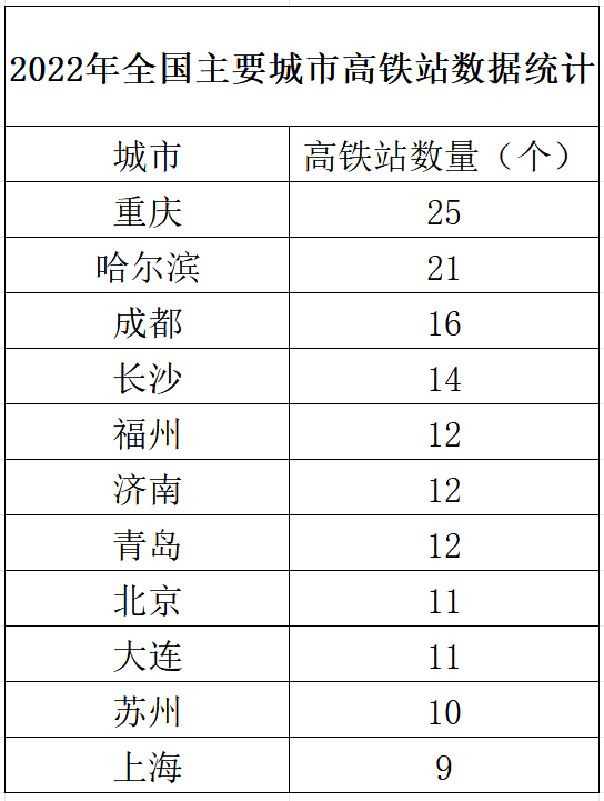 重慶作為我國西南腹地的一個運輸中心,以25個高鐵站位居榜首,作為東北門户城市的哈爾濱,竟然也有21個高鐵站