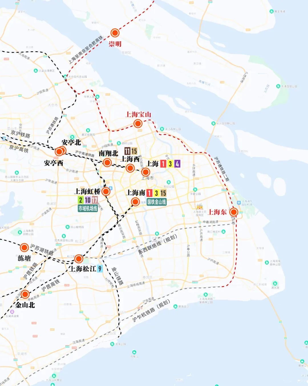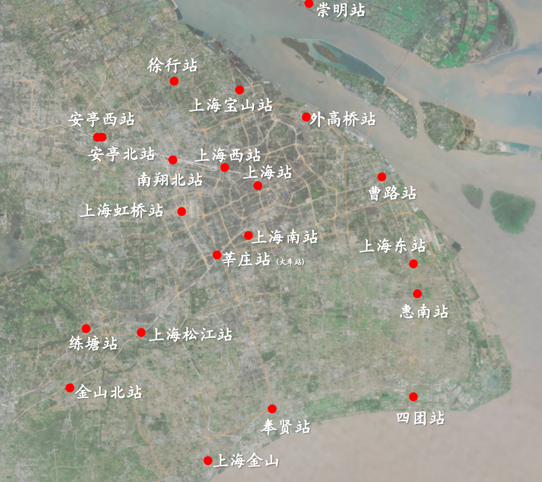 至此,上海已建成的10座高鐵站和3座在建高鐵站版圖如下: