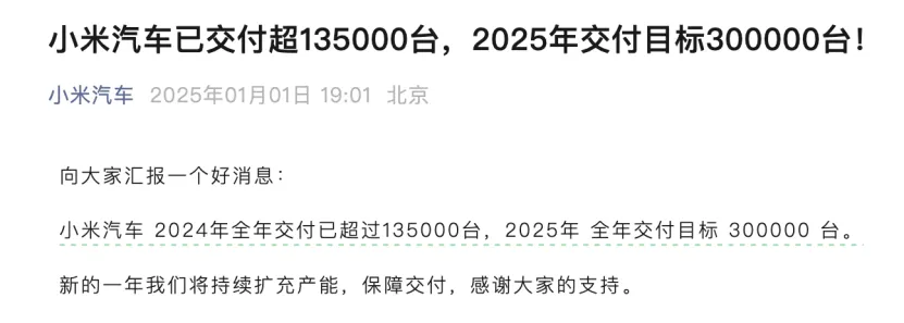 小米汽車今年1月1日發文,2025年小米汽車的交付目標是30萬台。