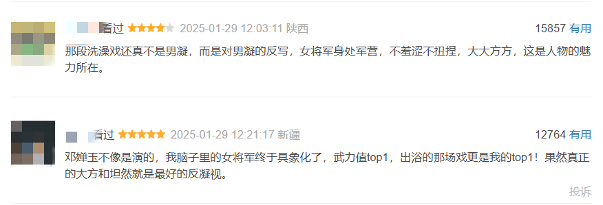 鄧嬋玉塑造之好,已經不僅僅是演員本身在動作戲、馬戲等方面所呈現出的個人素質,更是發乎於微末之處的。比如帳中洗澡的段落中,副將上前稟報軍情,但鄧嬋玉面不改色,從容着裝,反而是作為男性的副將自先羞赧難當。這是刨去凝視視角展現女性身體的難得範例,讓女將軍的形象不僅僅停留在表面,而是深入肌理。