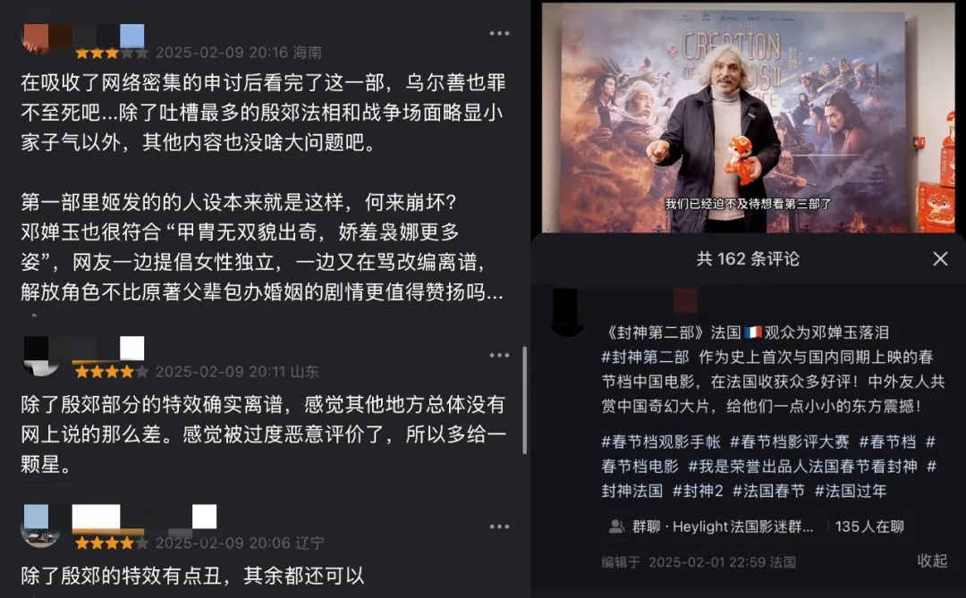 在春節檔的潮水褪去之後,如今再打開豆瓣觀察最新的短評,已經有不少三星、四星的真實評價陸續湧現。在海外上映後,《封神2》也收穫了不少海外觀眾的好評,成為2025年法國影院第一部售罄的電影。