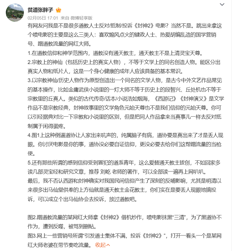 **更荒誕之處在於,對於人物設定的不滿,愈演愈烈,隨後竟然發展成了又一“獵巫”行動。**一些打着道士幌子的人士,聲稱《封神2》的角色塑造涉嫌侮辱道教,甚至向道教協會發起投訴。引得真正的道教人士出來澄清闢謠,直指“能區分出真實人物和紙片人,這是一個身心健康的成年人應該具備的基本常識。”