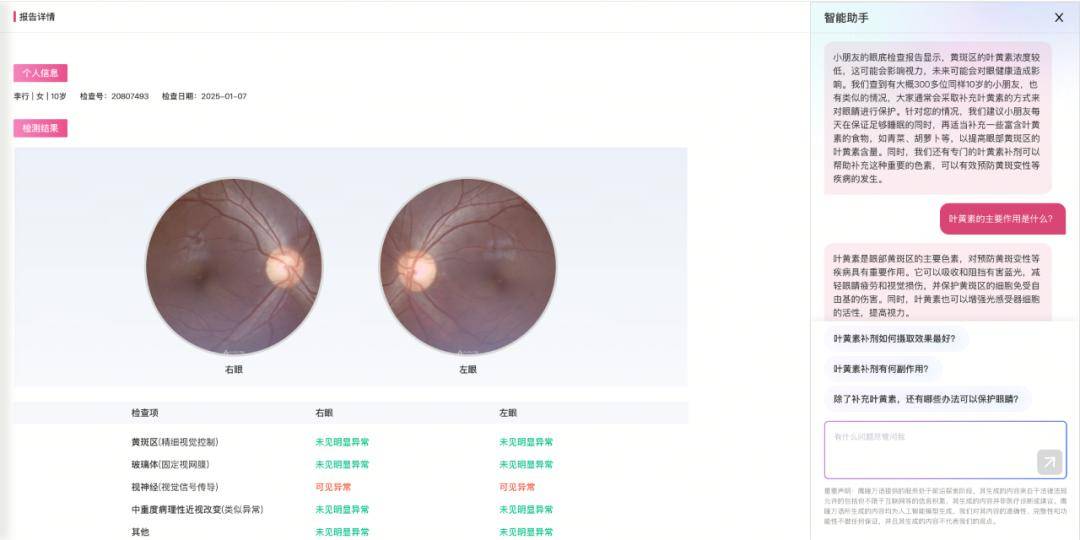 鷹瞳Airdoc作為人工智能視網膜影像領域的領導者和先行者,此次萬語醫療大模型的升級工作也完成了DeepSeek的接入,進一步推動人工智能在視網膜影像領域的應用,更好的服務人們的健康生活。鷹瞳萬語用於幫助醫療專業人員快速獲取醫學信息、臨牀指南和研究結果,提升決策效率;同時,也為患者提供個性化的健康狀況分析和治療方案建議,助力健康管理。