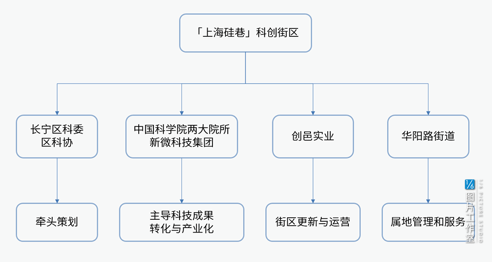 長寧區科委、科協主要負責牽頭策劃,中國科學院兩大院所與新微科技集團主導科技成果轉化與產業化,創邑實業是主要的街區更新與運營方,華陽路街道則是屬地管理和服務部門。