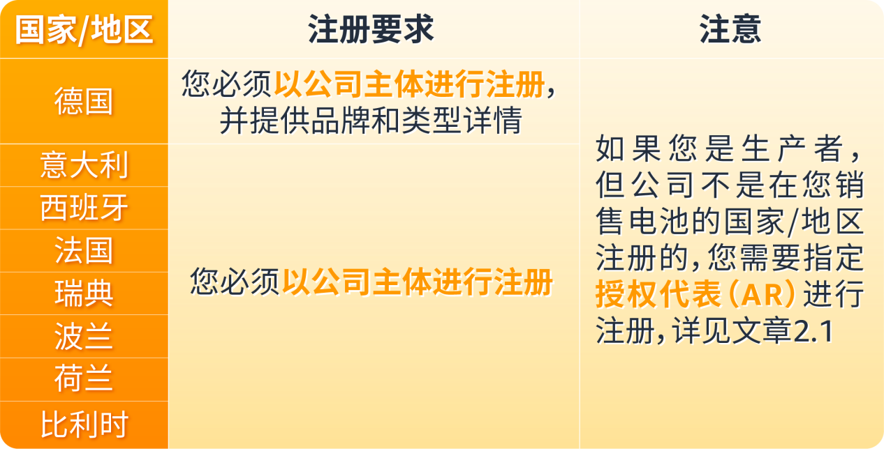 請中國賣家注意,根據歐盟電池法規,如果您是生產者,但公司不是在您銷售電池的國家/地區註冊的,則必須指定一名在銷售電池的國家/地區註冊公司的**授權代表(AR)**並通過他們進行註冊。