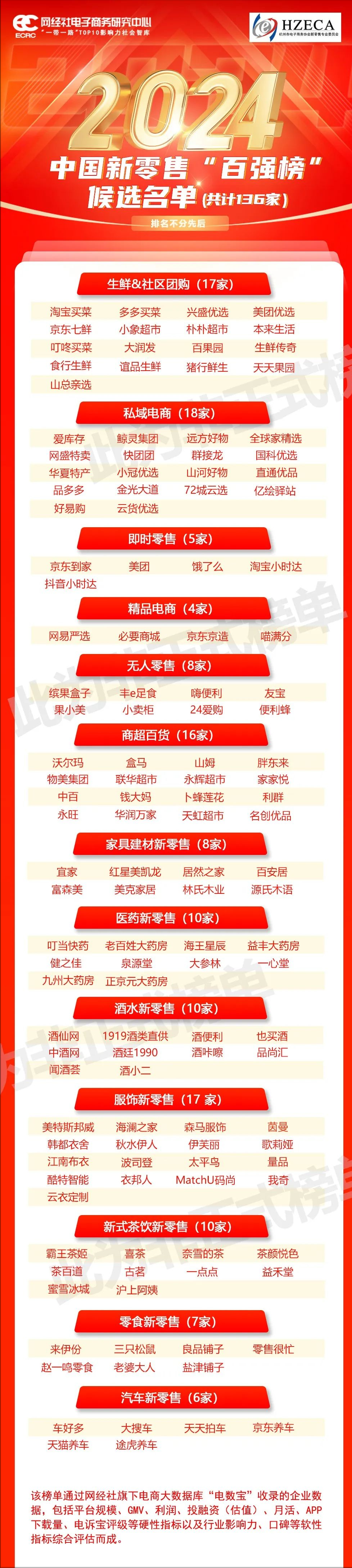 以下為《2024年中國新零售“百強榜”》候選名單,初步共計136家(排名不分先後):