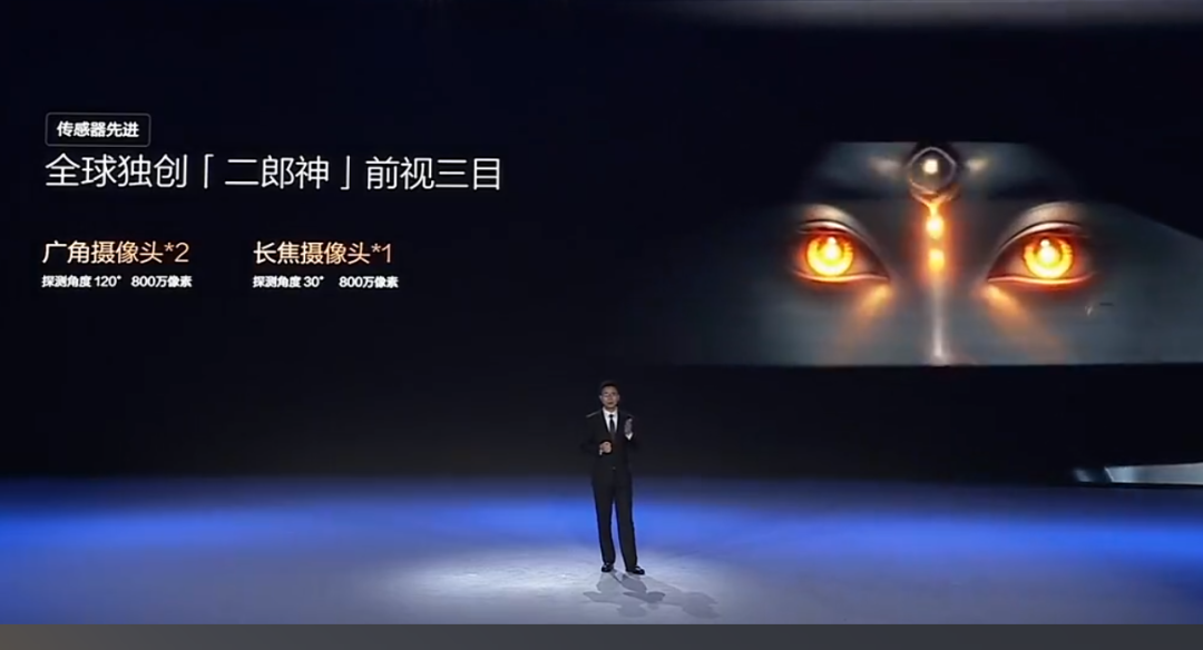 它的特點是前面用了一個三目攝像頭( 別家一般是雙目 ),兩個廣角,一個長焦,比亞迪管這個叫 “ 二郎神 ” 。。。