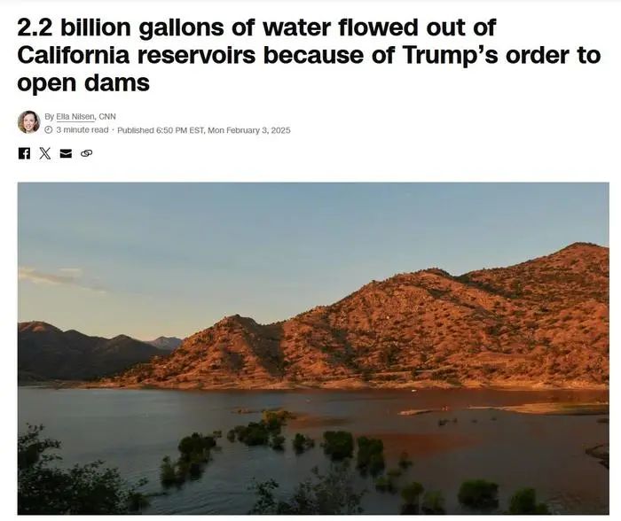 1月31日與2月1日,特朗普得意洋洋發帖宣稱,他在加州釋放了16億加侖的水,未來3天還會釋放52億加侖的水。