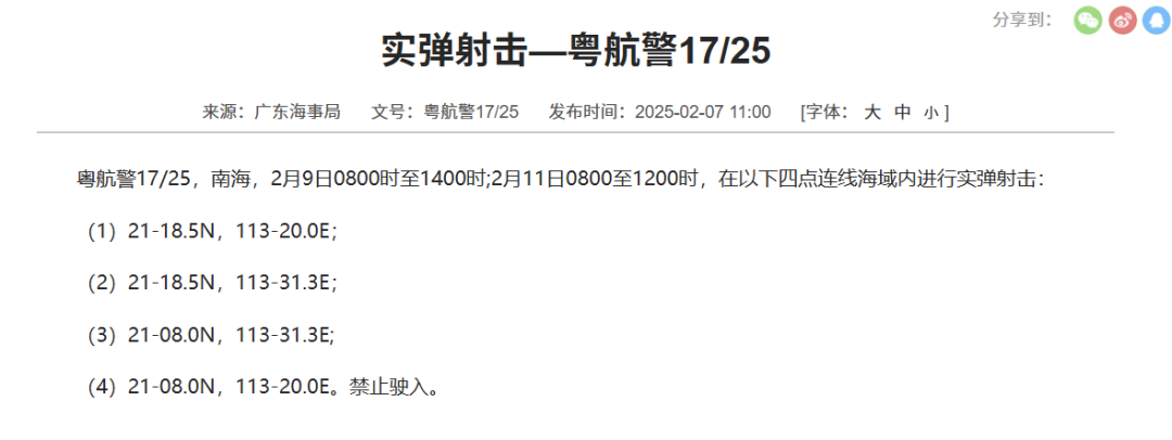 **第二,**廣東海事局發表聲明,準確的説,是航行警告,2月9日8時到14時、2月11日8時到12時,這段時間,中方會在南海部分海域進行實彈射擊,為保安全,禁止駛入。而縱觀2024年,解放軍在南海舉行實彈演習的次數,並不頻繁。