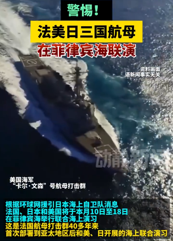 本次法美日三國聯合海上演練,名為“太平洋斯特勒-2025”,位於西太地區的菲律賓海域,在10日已正式開場,為期9天。法國“戴高樂”號航母、美國“卡爾·文森”號航母和日本海上自衞隊改裝航母“加賀”號,三艘航母齊聚,陣容不可謂不龐大。