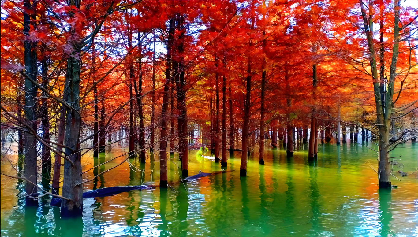 湘家蕩四季皆美,但冬日的湘家蕩別具韻味,尤其是景區南入口的那片紅杉林。清晨,我踏着霜花走進紅杉林,腳下的枯葉發出細碎的聲響,彷彿大地在輕聲訴説。這片紅杉林,宛如時光的守望者,在寒風中挺立着筆直的身軀,將天空分割成無數細長的藍色碎片。