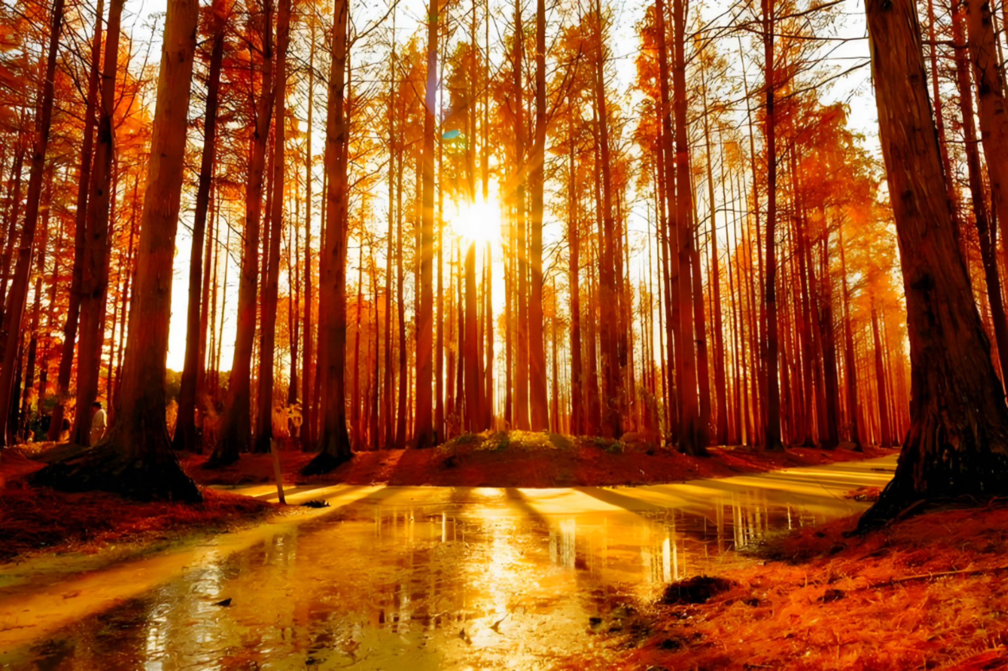 紅杉的枝幹褪去了夏日的青翠,換上一身赭紅的冬裝。那紅色並不張揚,像是被歲月打磨過的硃砂,又像是被寒露浸潤過的晚霞。陽光斜斜地穿過枝椏,在樹幹上投下斑駁的光影,彷彿給每棵樹都披上了一件金色的袈裟。偶爾有風掠過,樹梢輕輕搖曳,抖落幾片紅葉,在空中打着旋兒,宛如跳着優雅的華爾茲。