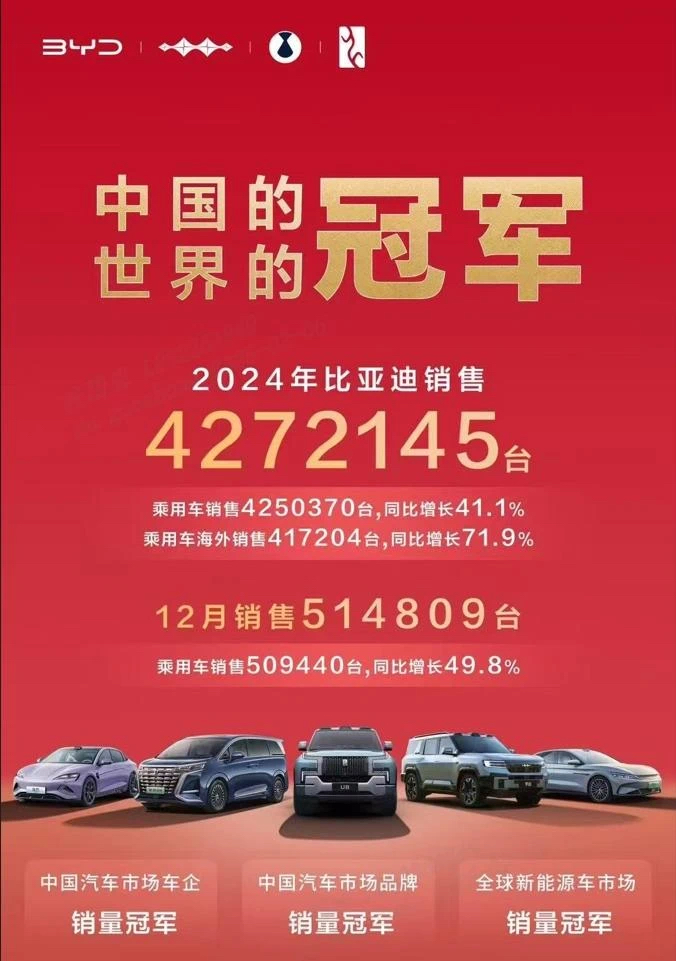 銷量是檢驗市場的硬指標。官方數據顯示,比亞迪2024年累計銷量達427萬餘輛,同比增長41.26%。全年海外銷量達417204輛,同比增長71.9%;淨利潤更是同比增長129.5%(基於2023年三季報數據),彰顯出其穩健的經營能力與強勁的增長潛力。