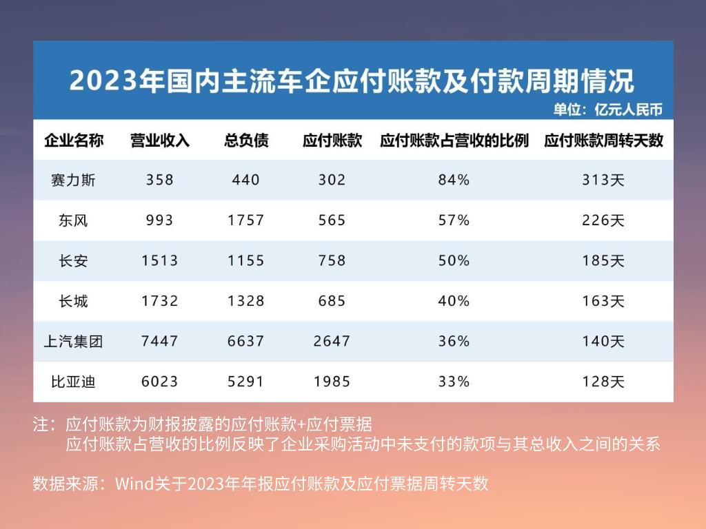 據Wind數據顯示,儘管上汽、比亞迪的應付賬款金額偏高,但佔營收比例卻相對偏低——賽力斯、東風集團股份、長安汽車、長城汽車的應付賬款佔營收的比例分別為84%、57%、50%、40%,而上汽集團、比亞迪則在36%、33%。