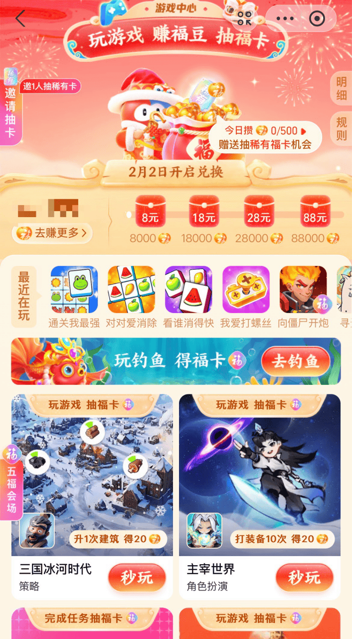 新年抽福卡的次數有限,玩小遊戲能積攢福豆換取更多抽卡機會,總之是閒着無聊,集福第一天,能不能抽到卡已經無所謂了,他的支付寶界面逐漸被小遊戲擠爆。
