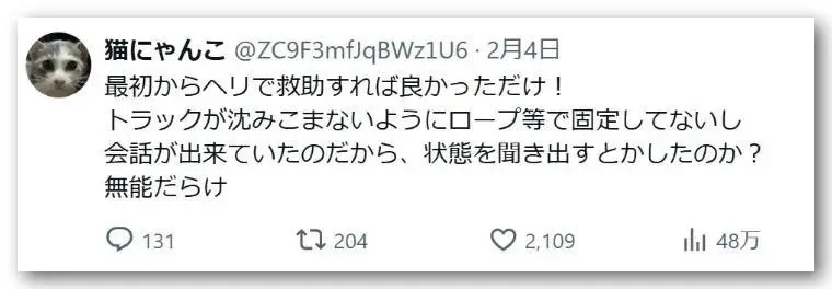 ”就是從最開始,直升機救援就可以的!沒用繩索等固定住,不讓卡車陷進去。能對話的,有沒問清司機的情況呢?全都太無能了”