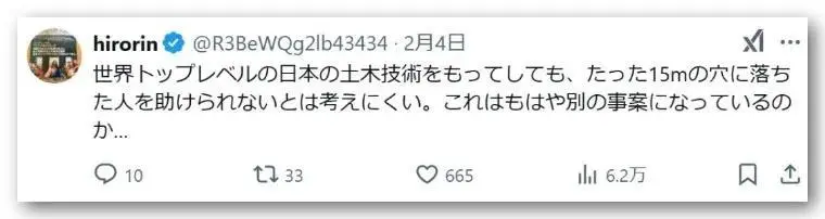 “就算擁有世界頂級水準的日本土木技術,難以想象,不過是人掉進15米深的坑裏,就救不了了。這事兒已經快成別的事件了吧……”