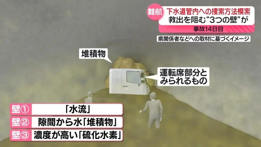 但八潮消防署署長表示,下水道內水流湍急且硫化氫濃度高,派人入內就面臨硫化氫中毒風險。積水、土壤脆弱、毒氣硫化氫,成了救援的三大障礙。