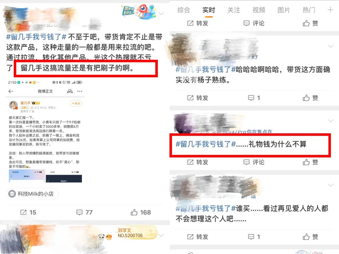 在留幾手彙報完自己的直播戰績後,“留幾手我虧錢了”話題緊接着登上了微博熱搜,在一眾調侃之餘,也有不少網友質疑,這只是其炒作引流的手段,還有網友表示“雖然帶貨沒賺錢,但是直播間刷禮物的錢不會少”。
