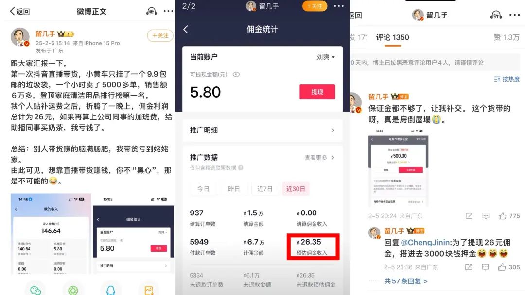 但在個人補貼運費之後,留幾手表示其佣金利潤僅為26元,如果加上給同事的加班費和奶茶費,實際上是虧錢了。留幾手還在評論區補充道,為了提現這筆佣金,自己還需要補交3000元的押金,“這個貨帶的呀,真是房倒屋塌”。