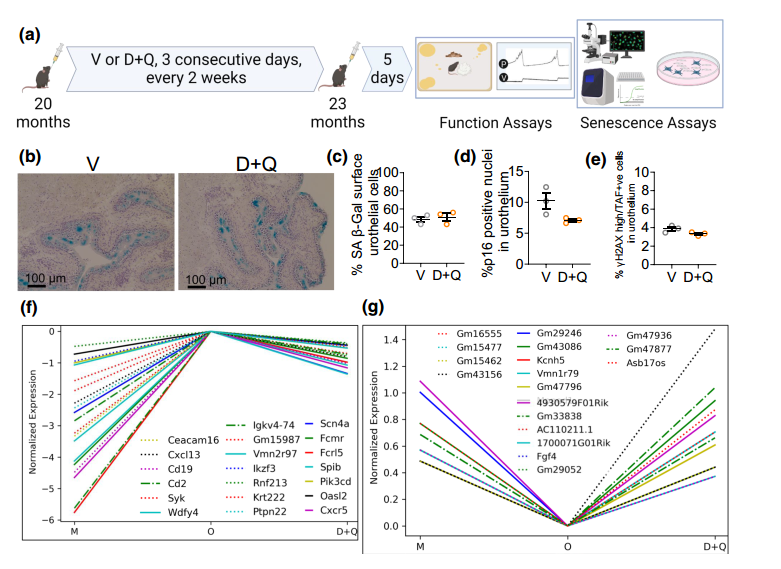 對UCs沒有用,但“測都測了“,研究人員也順手觀察了D+Q組合通過清除身體其他部位的衰老細胞來改善膀胱功能的能力。