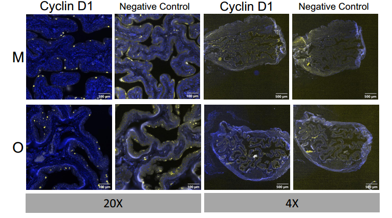 圖注:中年和老年小鼠膀胱切片中Cyclin D1蛋白的免疫熒光染色情況