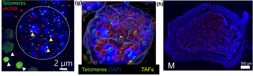 圖注:端粒相關焦點檢測(如果綠色(端粒)和紅色(γH2AX)信號重疊在一起,形成黃色的TAFs焦點,説明這個細胞可能已經進入了衰老狀態)