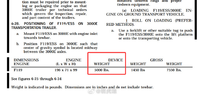 F119的重量數據來源於美國空軍官方發佈的發動機運輸指南 圖3(編號:T0 00-85-20),F135的兩個子型號的重量數據來源於同樣的文件 圖4,是一份2018年增補進去的附件。F119發動機乾重約5000磅(2268千克,含二元矢量噴管),F135乾重6422磅(2913千克),F135帶升力風扇版7260磅(3293千克)。