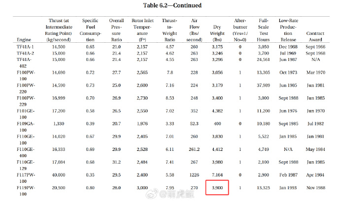 你可能會説,這也太顛覆我的刻板印象了,這倆發動機怎麼會這麼重?? 會不會是定義學問題?有個很簡單的驗證方法,在同一份文件中檢查四代機的發動機重量不就知道了?圖5 展示的我們所熟悉的F110-GE-129的數據,我們都知道這款發動機的美標乾重約1.8噸,文件顯示的3980磅(1805kg)的weight完全符合這個記憶中的數據,所以可以很明確地説這倆貨就是這麼重。