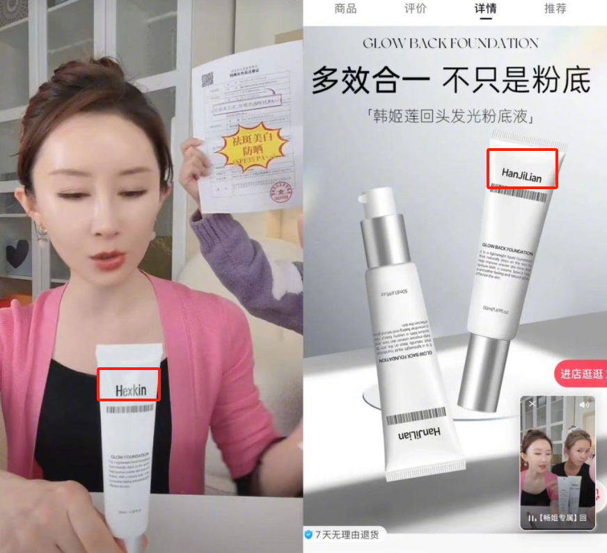 比如舒暢在直播裏介紹 Hexkin 產品,但鏈接裏賣的卻是 HanjiLian 。