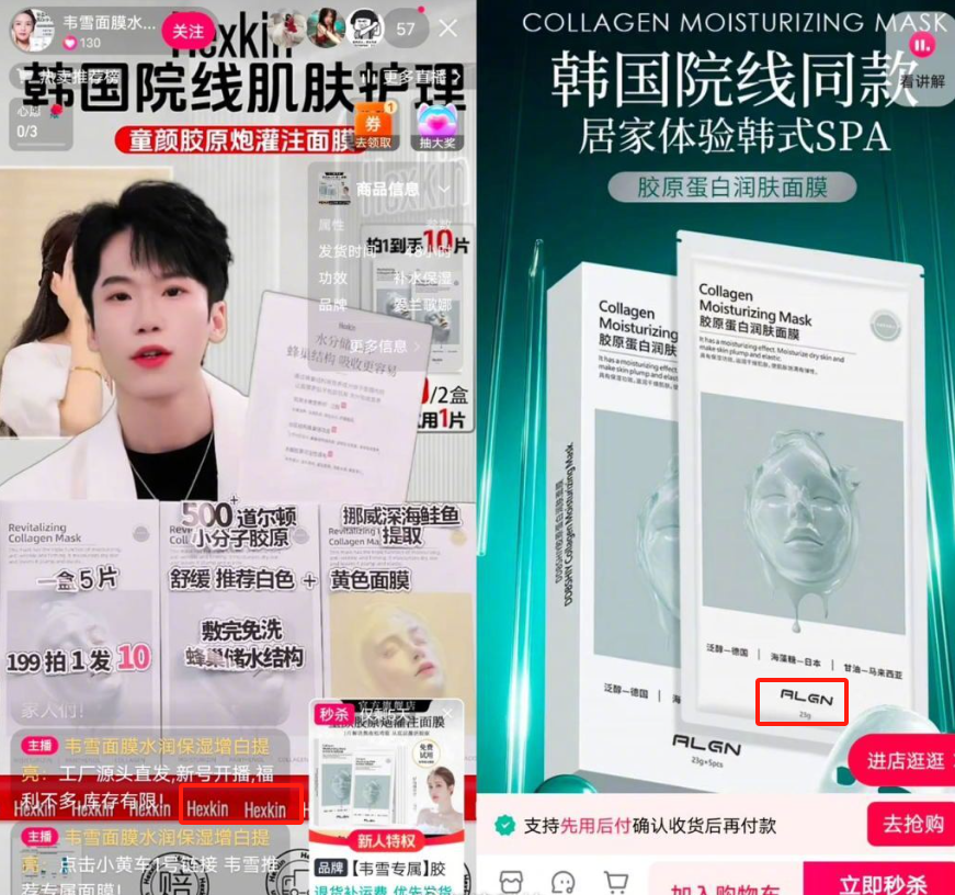 主持人介紹的是 Hexkin ,展示的是 Hexkin ,背景板等各種露出信息是 Hexkin ,宣稱正品保證,強調韋雪推薦。
