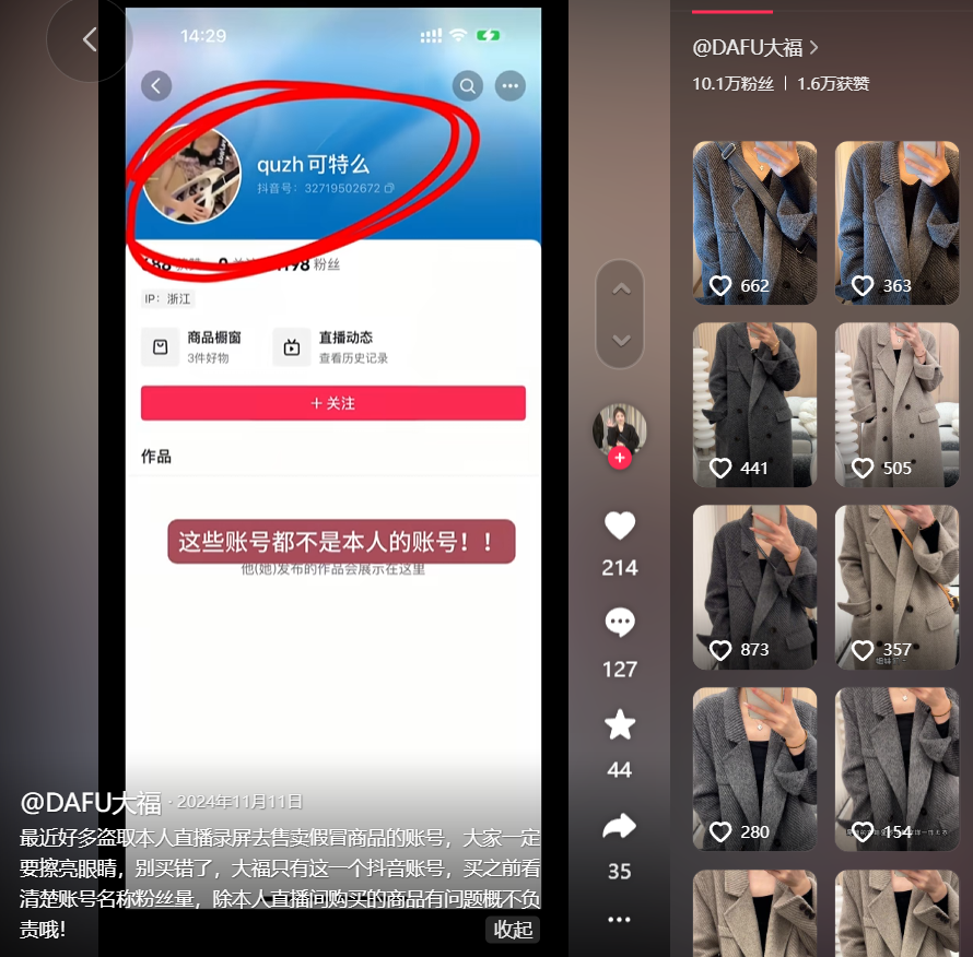 比如 DAFU大福,一位粉絲量級在 10 萬的女裝穿搭主播,被多個賬號盜播,不堪其擾。。。
