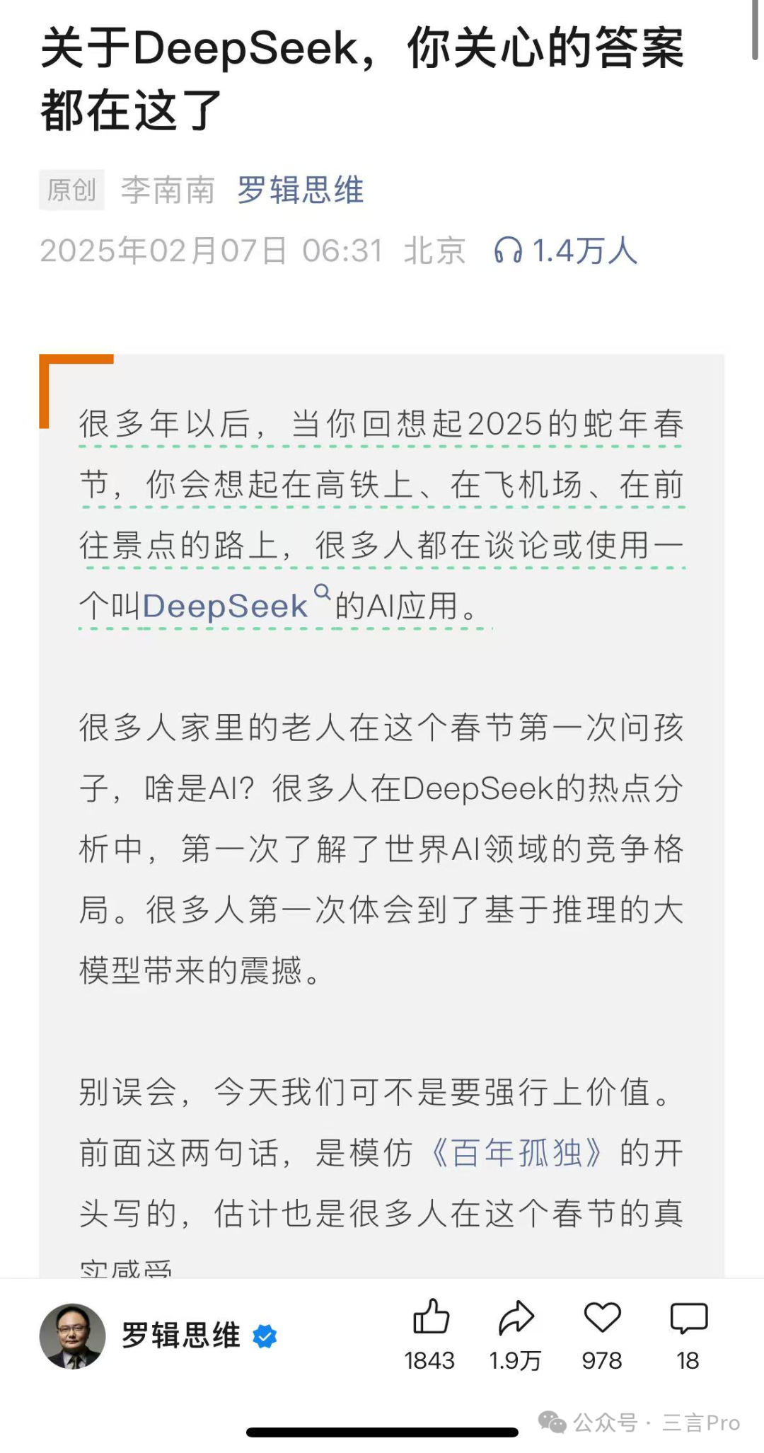 幾天前,羅振宇的羅輯思維發了篇有關DeepSeek的文章,在文章底部就推薦了聯合創始人快刀青衣的AI課程。