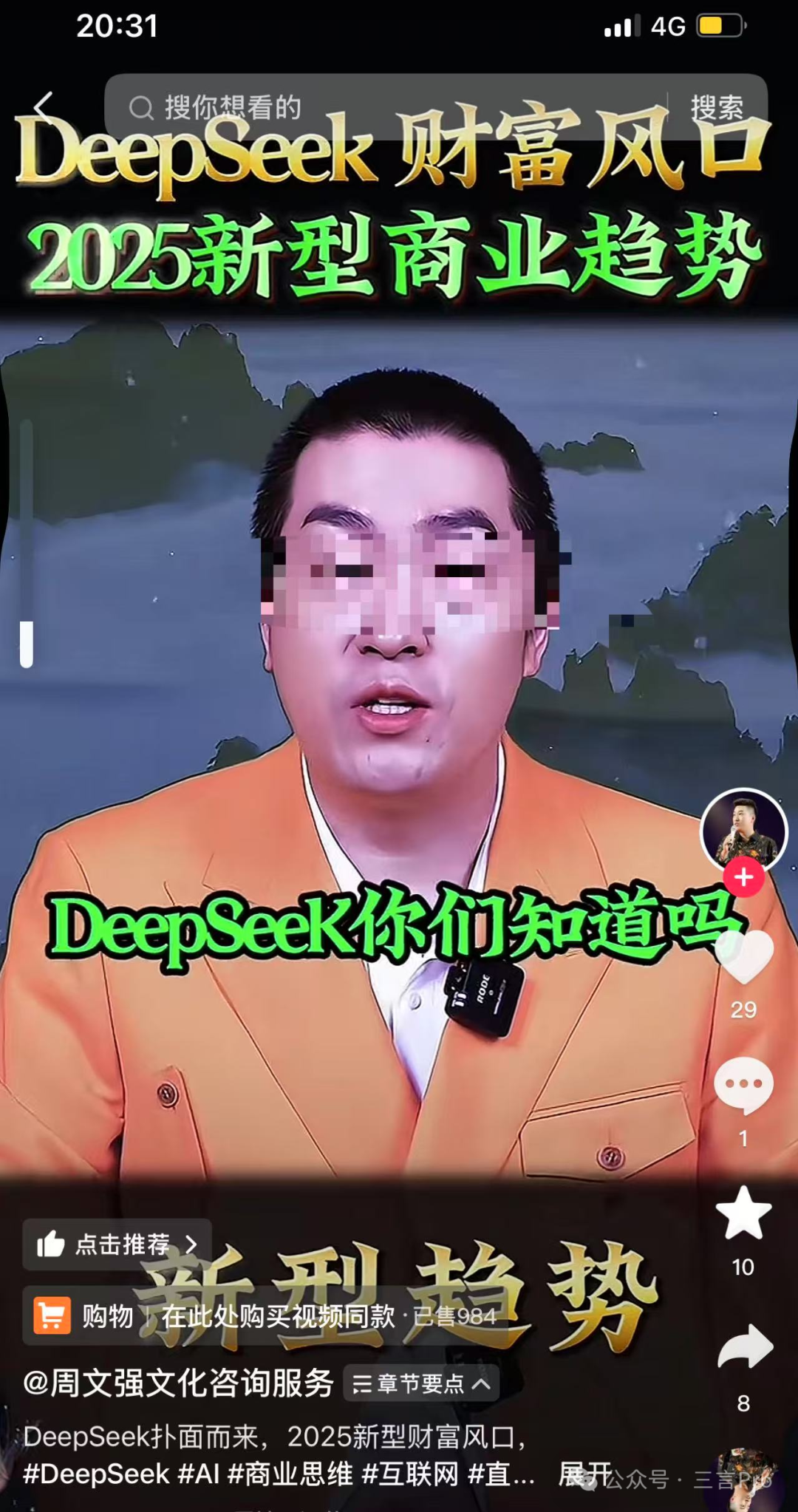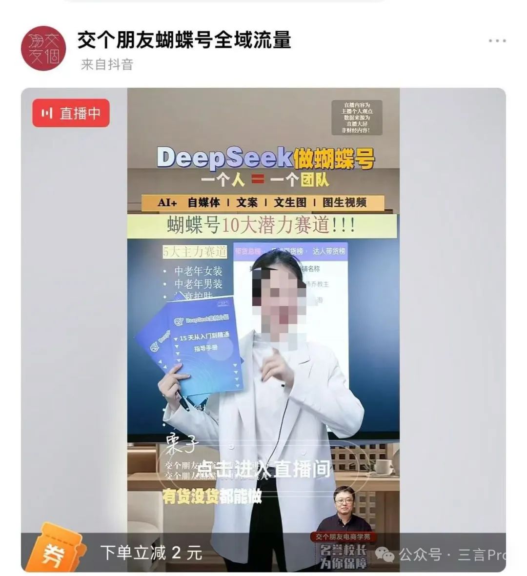 三言發現視頻中明明是講DeepSeek,而帶貨的課程卻是有關如何開直播的。