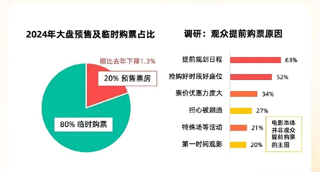 預售階段的“養精蓄鋭”,很大一部分原因基於市場環境的變化做出的策略調整。毒眸在往期的檔期覆盤和年度盤點中就頻繁提到,疫情之後,觀眾的購票決策明顯後置,預售階段不再能“一決勝負”。據燈塔報告,2024年全年電影市場預售積極性持續下降,臨時購票佔比80%。