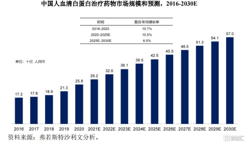 2025年,中國人血清白蛋白治療藥物市場規模預計達到425億元,複合年均增長率10.5%,2030年市場規模預計570億元,2025年至2030年複合年均增長率6.0%。