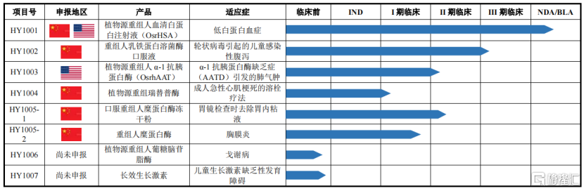 進度最快的是核心產品HY1001植物源重組人血清白蛋白注射液,該產品III期臨牀研究結果顯示,已達到主要和次要臨牀研究終點,展現出良好的安全性。