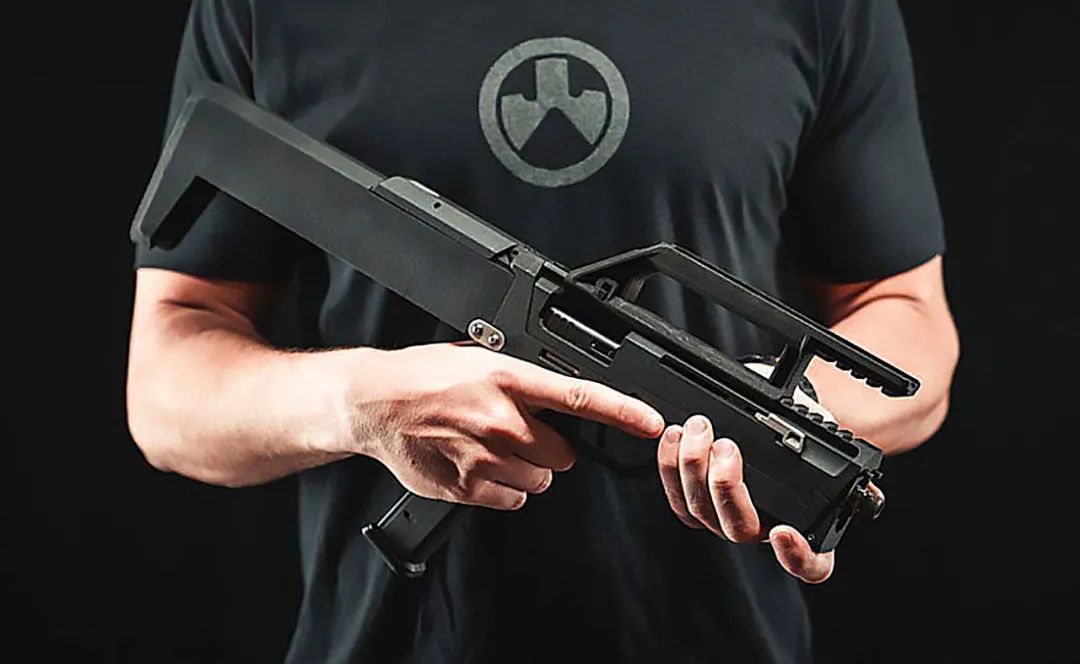 從外觀上看,“墨者”顯然很大程度上參考了美國馬蓋普FMG-9摺疊衝鋒槍的設計思路,摺疊收納時,整個套件就像一個方盒子,看不出槍械的形狀,而展開後就成了一把可以抵肩射擊,短小精悍的武器。