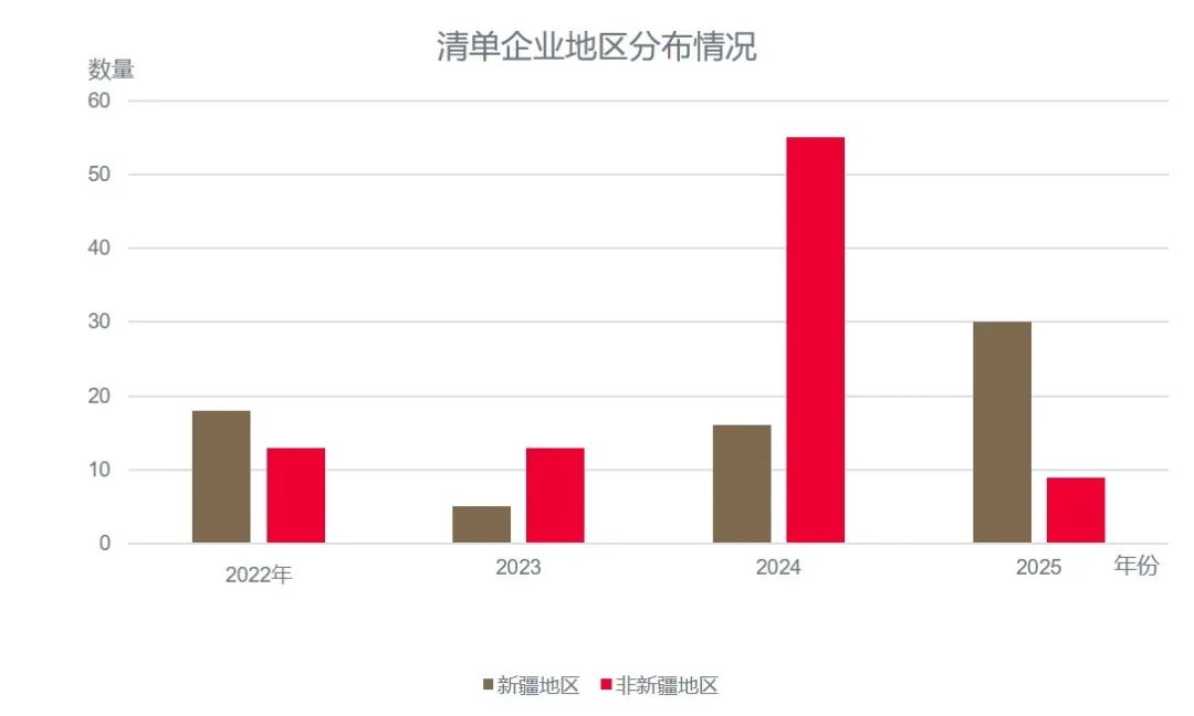 2024年,因“涉疆原料採購”被指存在“強迫勞動”而列入UFLPA實體清單(即第五類UFLPA實體清單[3])的中國實體數量近60個,佔當年清單新增的絕大多數。以“提供相關協助”(即第二類UFLPA實體清單)為由新增中國實體僅10餘個,而其他原因項下未出現新增實體。總觀2022年6月至2025年1月期間,因“涉疆原料採購”被列入清單的實體佔到60%以上。