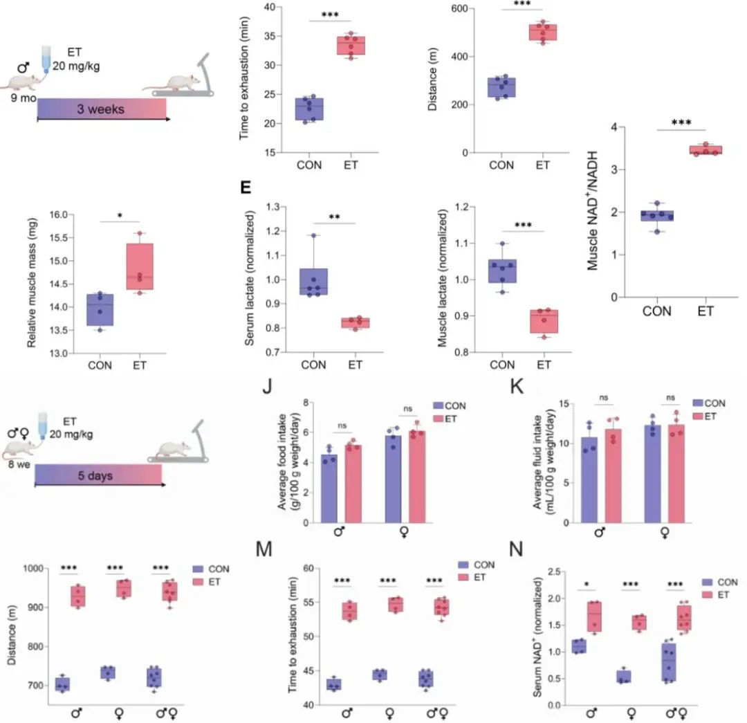 大鼠們肌肉更有力量了,血管更健康了,幹細胞也更活躍了,運動時不僅不易疲勞(乳酸變少,肌肉酸性減弱,能量供應更穩定),力竭的時間和距離也翻了一倍;即使“療程”縮短至只有5天,也能顯著提升NAD+的水平!