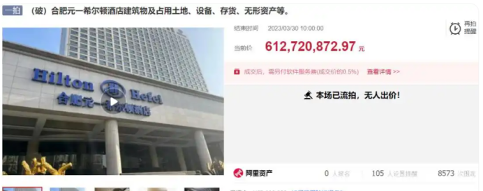 2023年3月,合肥一希爾頓酒店建築物以6.13億元的價格起拍,最終因無人出價而流拍。