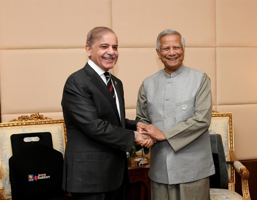 2024年12月19日,巴基斯坦總理夏巴茲·謝里夫(左)與孟加拉國臨時政府首席顧問尤努斯在埃及參加第11屆發展中國家八國集團峯會期間舉行會晤。圖源:“世界知識”微信公眾號