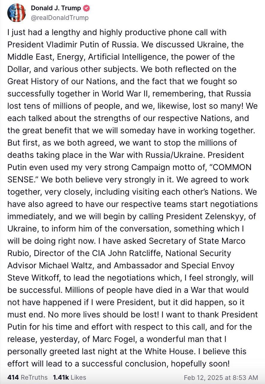 俄羅斯方面提供的談話內容稱:在與普京的對話中,特朗普表示支持儘快結束烏克蘭的敵對狀態。同時,普京闡述了消除烏克蘭衝突根源的必要性。 兩人還討論了有關中東問題以及俄美雙邊關係。兩人同意組織一次會面,但目前還沒有其他具體安排。普京表示同意特朗普的觀點,即是時候該共同努力通過談判實現烏克蘭的長期和平。